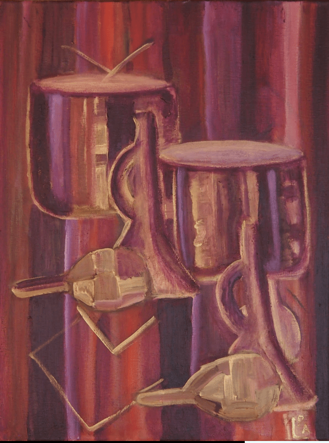 My painting Musical Instruments is a metaphor for my intercultural journey. I chose this theme, inspired by Yo-Yo Ma, the famous cellist, after spending a memorable evening at the Kennedy Center in Washington, DC, listening to his exquisite musical talent.